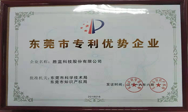 2018年勝藍公司獲得“東莞市專利優(yōu)勢企業(yè)”稱號!